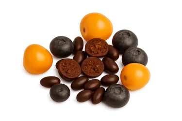 Goldenberries and blueberries covered in 70% fine aroma cacao. This blend delivers a bright burst of flavor, combining the tangy character of dried fruit with the sweetness of Ecuadorian chocolate.